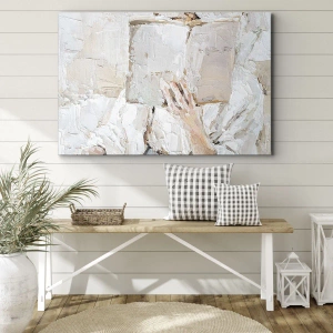 A "Egy másik világban" című festmény egy egyedi műalkotás, amely a finom tükröződés légkörébe repíti a nézőt. A nyitott könyvet tartó kéz impresszionista ábrázolása finomságával és művészi kifejezésmódjával gyönyörködtet. A finom bézs árnyalatok harmonikus kompozíciót hoznak létre, amely békét és eleganciát visz a belső térbe.