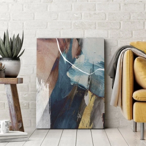 - Modern absztrakt festmény 70x50 cm-es vászonra. Kék, arany és fehér árnyalatai dominálnak, dinamikus ecsetvonásokkal. Tökéletes faldekoráció nappaliba, hálószobába vagy irodába, eleganciát és művészi hangulatot kölcsönöz.