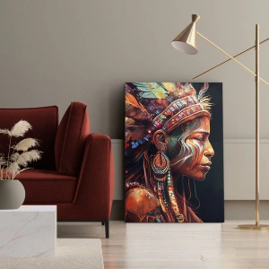 A festményen ábrázolt alak békét és spirituális kapcsolatot sugároz a környezettel. Színes tollak, gondosan kidolgozott részletek és harmonikus kompozíció mélységet és szimbolikus jelentést kölcsönöz a festménynek. Az eredeti vászonminta melegséget és egy csipetnyi misztikumot visz a belső térbe.