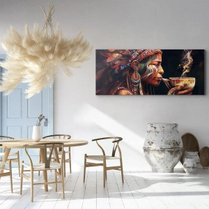 • Ez a 70x50 cm-es vászonkép egy színes, etnikai stílusú alakot ábrázol egy gőzölgő itallal teli csészével. Tökéletes bohém stílusú enteriőrökbe, tele meleg színekkel és kulturális részletekkel.