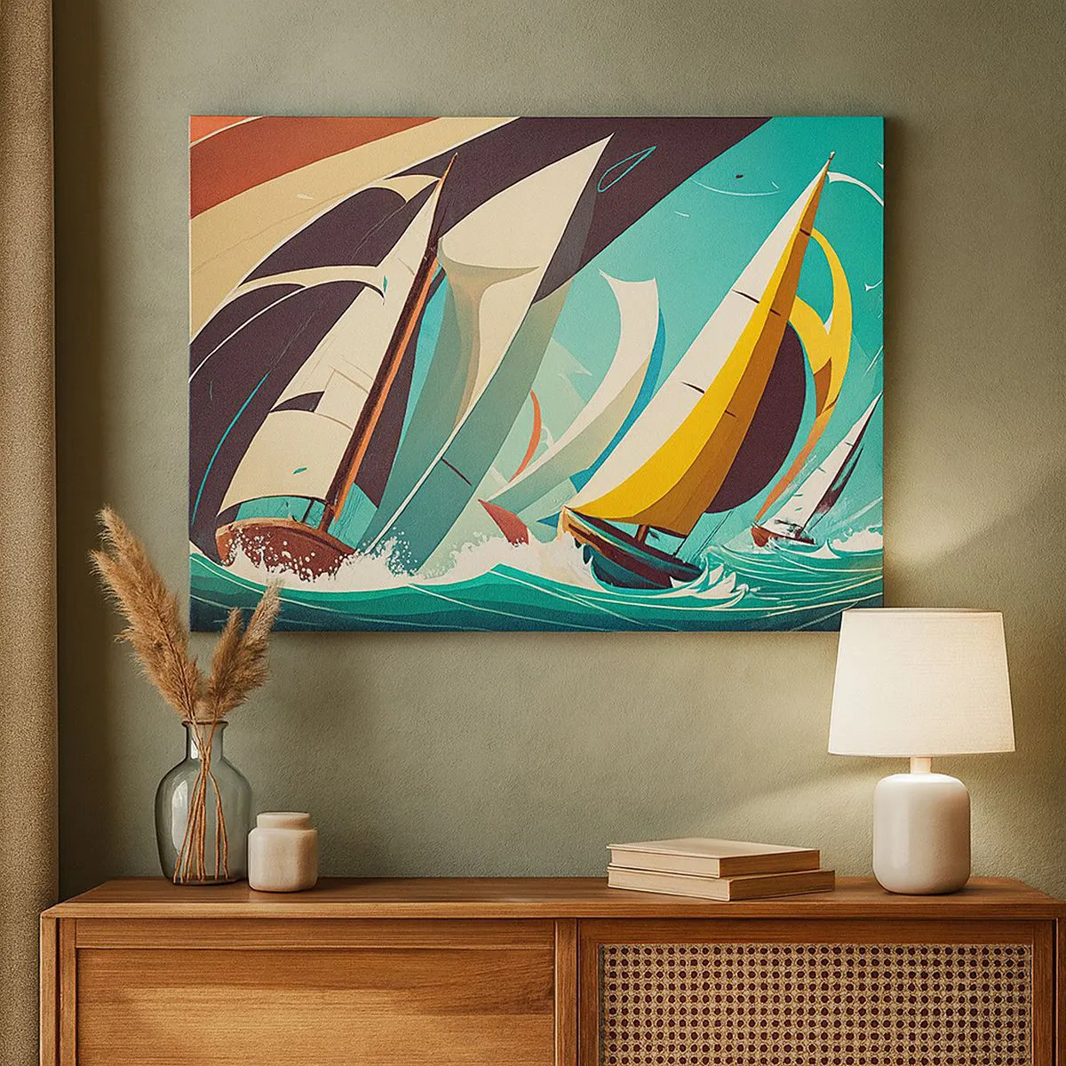 Vászonkép - Vitorláshajók dinamikus illusztrációja viharos tengeren. - 70x50cm - Közelről és személyesen az elemekkel - Modern fali dekoráció nappalihoz és hálószobához ARTTOR