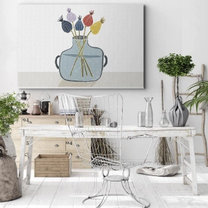 - Egy visszafogott hatású festmény, amely színes, szárított virágokat ábrázol vázában, fehér háttér előtt. Tökéletes választás az egyszerűség és a természetes dekoráció kedvelőinek, harmóniát és stílust visz bármilyen enteriőrbe.