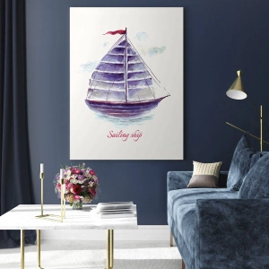 • vitorlás, tengerpart, tenger, Gyermekeknek, Tengerészeti, Pasztell, Utazás, Art, A fürdőszobába, a gyerekszobába, az előszobába, a hálószobába, Fehér, lila, Függőleges