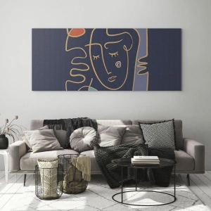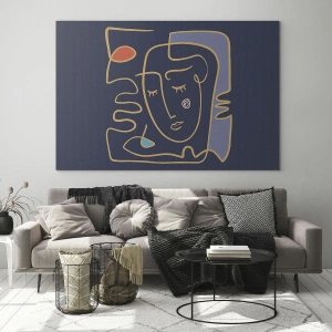 - Egy modern grafika, amely egy absztrakt arcot ábrázol, kontúrvonalakkal megrajzolva sötétkék háttér előtt. A kép kitűnik finom stílusával, kontrasztos színeivel és minimalista formájával. Tökéletes modern enteriőrökbe.