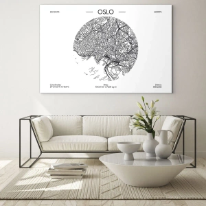 Az "Oslo anatómiája" című festmény Norvégia fővárosát mutatja be modern és művészi értelmezésben. A kompozíció középpontjában a város részletes, fekete-fehér térképe áll, amely hangsúlyozza minimalista jellegét. Ez a motívum tökéletesen illeszkedik a skandináv és a modern belső terek esztétikájába. Formájának egyszerűségének és a felesleges grafikai elemek hiányának köszönhetően a térkép vizuális tisztaságával vonzza a figyelmet. Oslo, mint vezető motívum, érzelmi jelentést ad a műnek – tisztelgés az északi kultúra, a térszervezés és a modern várostervezés előtt.