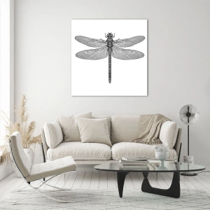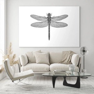 Üveg kép - Részletes illusztráció egy szitakötőről gravírozási stílusban, fehér alapon - 70x50cm - A természet precizitása - Modern fali dekoráció nappalihoz és hálószobához ARTTOR