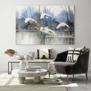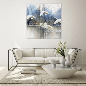 - Ez a festmény vadhattyúkat ábrázol, amint egy téli erdővel körülvett nyugodt tó felett repülnek. Hangulatos, kecses tájkép, amely tökéletes természet ihlette belső terekbe.
