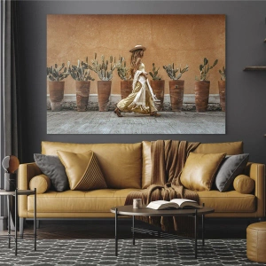 Üveg kép - Egy bohém stílusú nő sétál el a kaktuszok cserepei mellett. - 70x50cm - Hippi stílusban - Modern fali dekoráció nappalihoz és hálószobához ARTTOR
