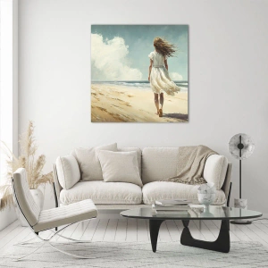 Üveg kép - Egy fehér ruhás nő mezítláb sétál a napsütötte tengerparton - 70x50cm - Találkozás a nappal és a széllel - Modern fali dekoráció nappalihoz és hálószobához ARTTOR