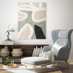- A festmény absztrakt alakokat és formákat ábrázol bézs és zöld árnyalatokban, határozott fekete akcentussal. A minimalista forma és a természetes színpaletta modern, kiegyensúlyozott kompozíciót teremt.