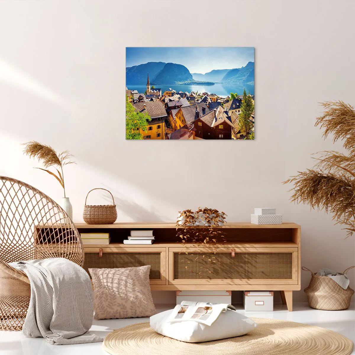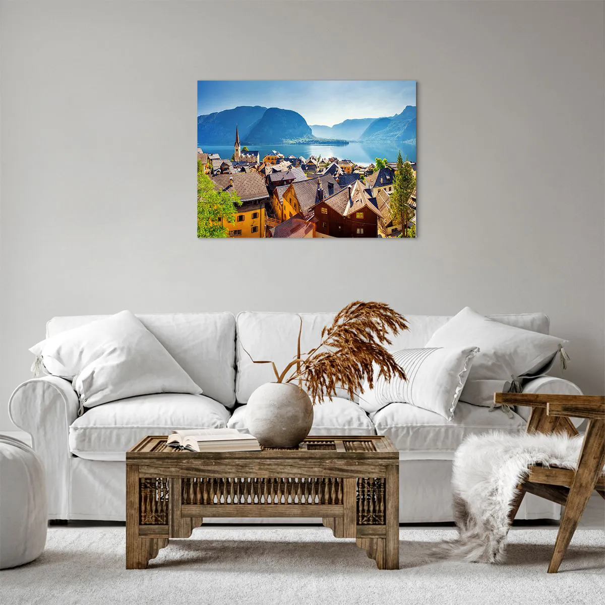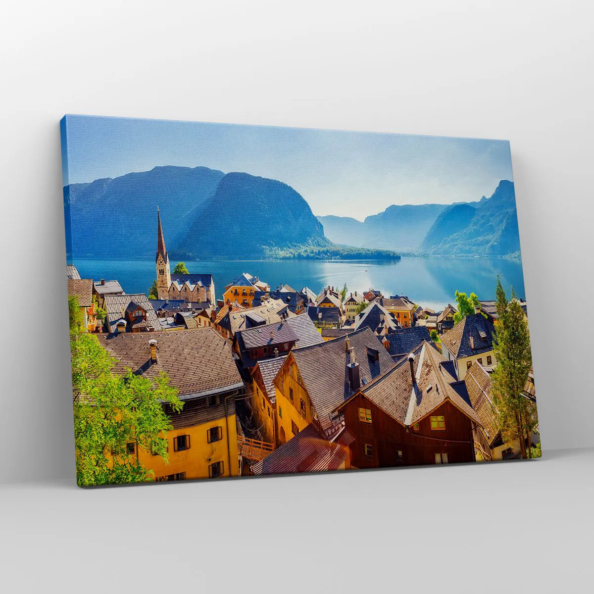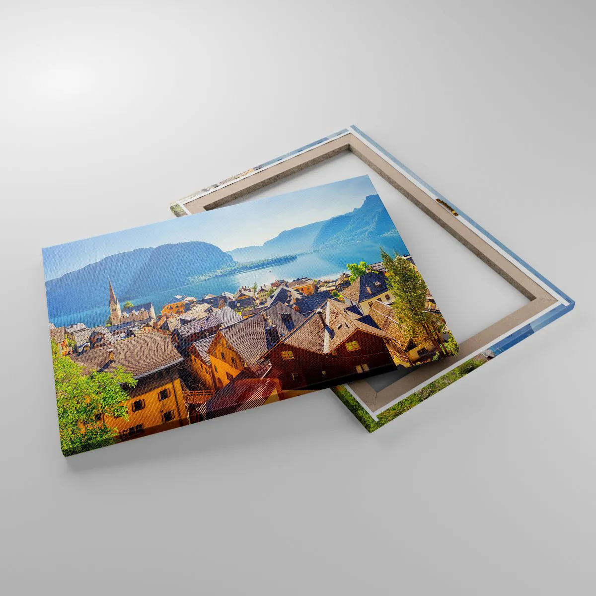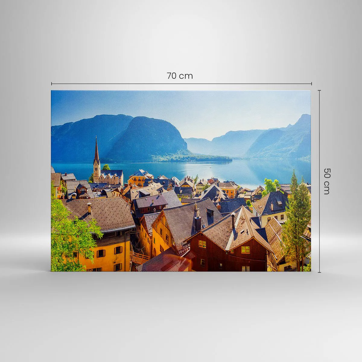 Vászonkép - Egy festői falu egy tó partján, hegyek veszik körül egy napsütéses napon - 70x50cm - Nem is lehetne festőibb - Modern fali dekoráció nappalihoz és hálószobához ARTTOR