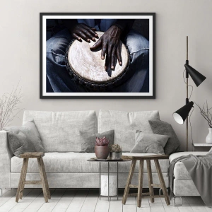 Poszter fehér keretben - Kezek djembe dobon játszanak egy ritmusjátékban - 50x70cm - Élj a saját ritmusodban - Modern fali dekoráció nappalihoz és hálószobához ARTTOR