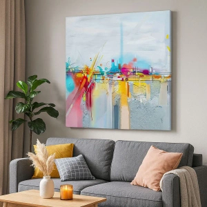- Ez a vászonkép egy absztrakt tájképet ábrázol élénk színekkel és geometriai formákkal. Modern dekoráció, amely energiát és művészi kifejezést visz bármilyen enteriőrbe.