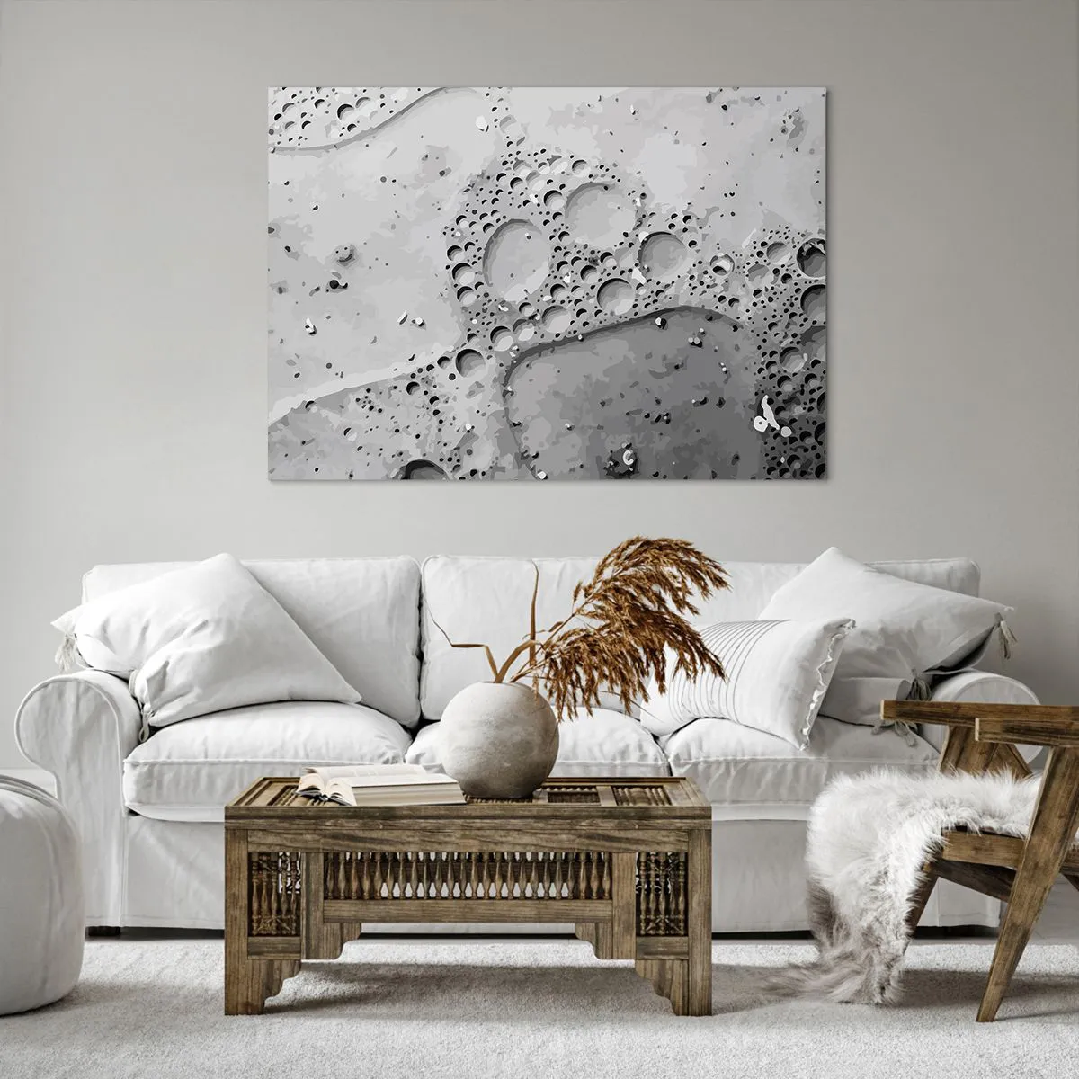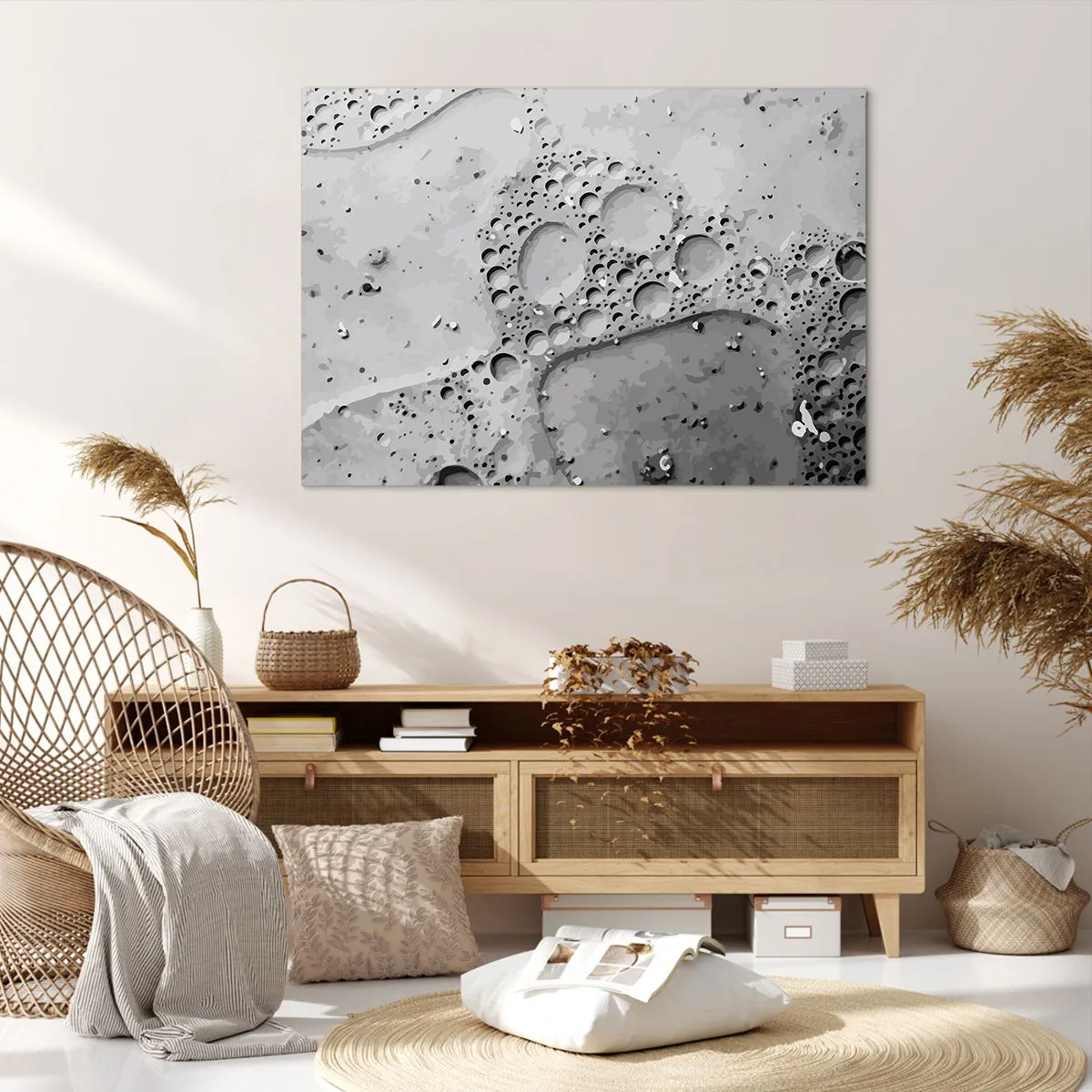 A vászon a keretre van feszítve. Az oldalak és a szélek nyomtatva vannak, a kép folytatását alkotva. A kép készen áll a falra akasztásra. Minden termékhez tartozik egy, a kerethez rögzített akasztó és egy rögzítőkészlet (csavar + dübel).