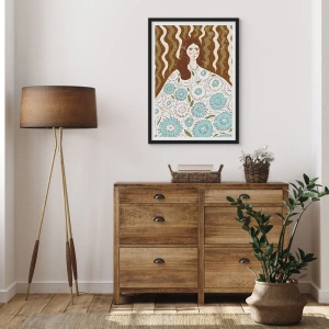 Poszter fehér keretben - Stilizált portré egy virágmintás ruhás nőről hullámos minták hátterében. - 50x70cm - Portré virágos köntösben - Modern fali dekoráció nappalihoz és hálószobához ARTTOR