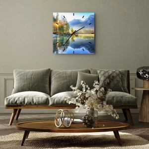 Falióra, Óra - Hegyi tó hajnalban, fák és csúcsok tükröződésével - 30x30cm - Fenség és édesség - Modern fali dekoráció nappalihoz, konyhához és hálószobához ARTTOR