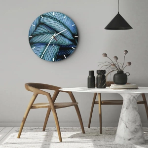 - Ez az óra, amelyen türkiz és sötétkék árnyalatú tollak közeli felvétele látható, egyedi textúrájú és elegáns stílusú dekoratív elem. Tökéletes modern, művészi és színkiegyensúlyozott belső terekbe.