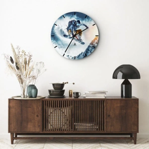 A "Extrém érzelmek" falióra egy dinamikus dekoráció, amelyet a téli sportok és a cselekvés energiája ihletett. A 30x30 cm-es kerek üvegkorong lenyűgöző grafikát ábrázol, amely egy snowboardost ábrázol a levegőben, amint egy havas lejtő felett lebeg. Az alakot kavargó hó veszi körül, a háttérben pedig egy fenséges hegyi táj húzódik, éles csúcsokkal, amelyeket a téli napsugár világít meg.