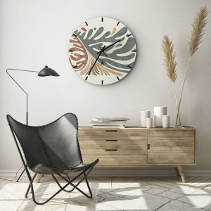A Többszínű Levél Falióra a természet ihlette formák művészi és modern vízióját mutatja be. Számlapja szimmetrikus kompozíciójú, organikus formákat tartalmaz, amelyek levelekre vagy növényi töredékekre hasonlítanak. A földszínek dominálnak – zöld, rozsdás narancs, bézs és barna –, amelyek tökéletesen harmonizálnak a világos háttérrel.
