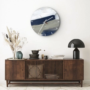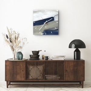 - Ez a 30x30 cm-es falióra egy absztrakt kompozíciót ábrázol fehér és sötétkék árnyalatokban. A minimalista ecsetvonások kontrasztos és modern motívumot hoznak létre.