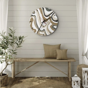 - 30x30 cm-es kerek falióra, földszínű hullámos csíkok absztrakt kompozíciójával. Harmonikus, természetes dizájn, amely magára vonzza a tekintetet.