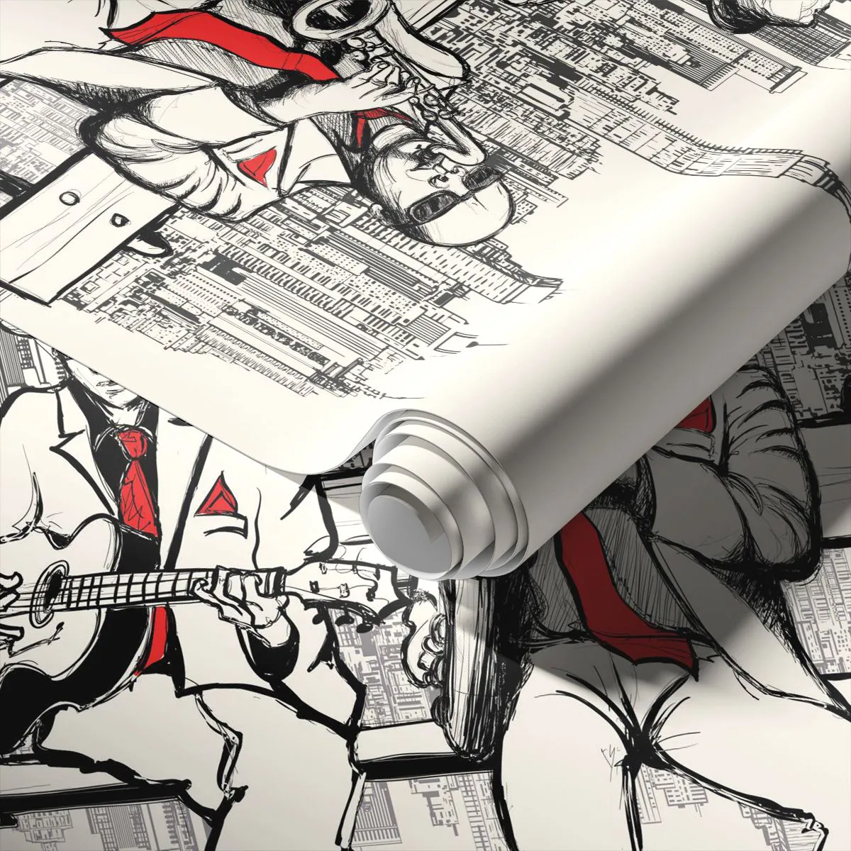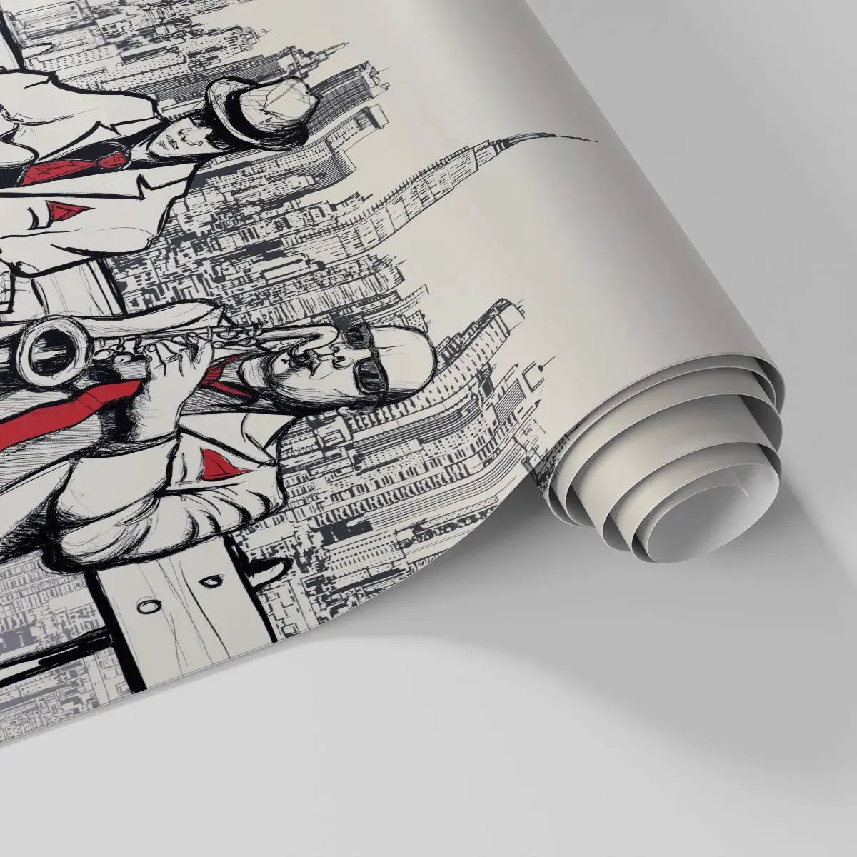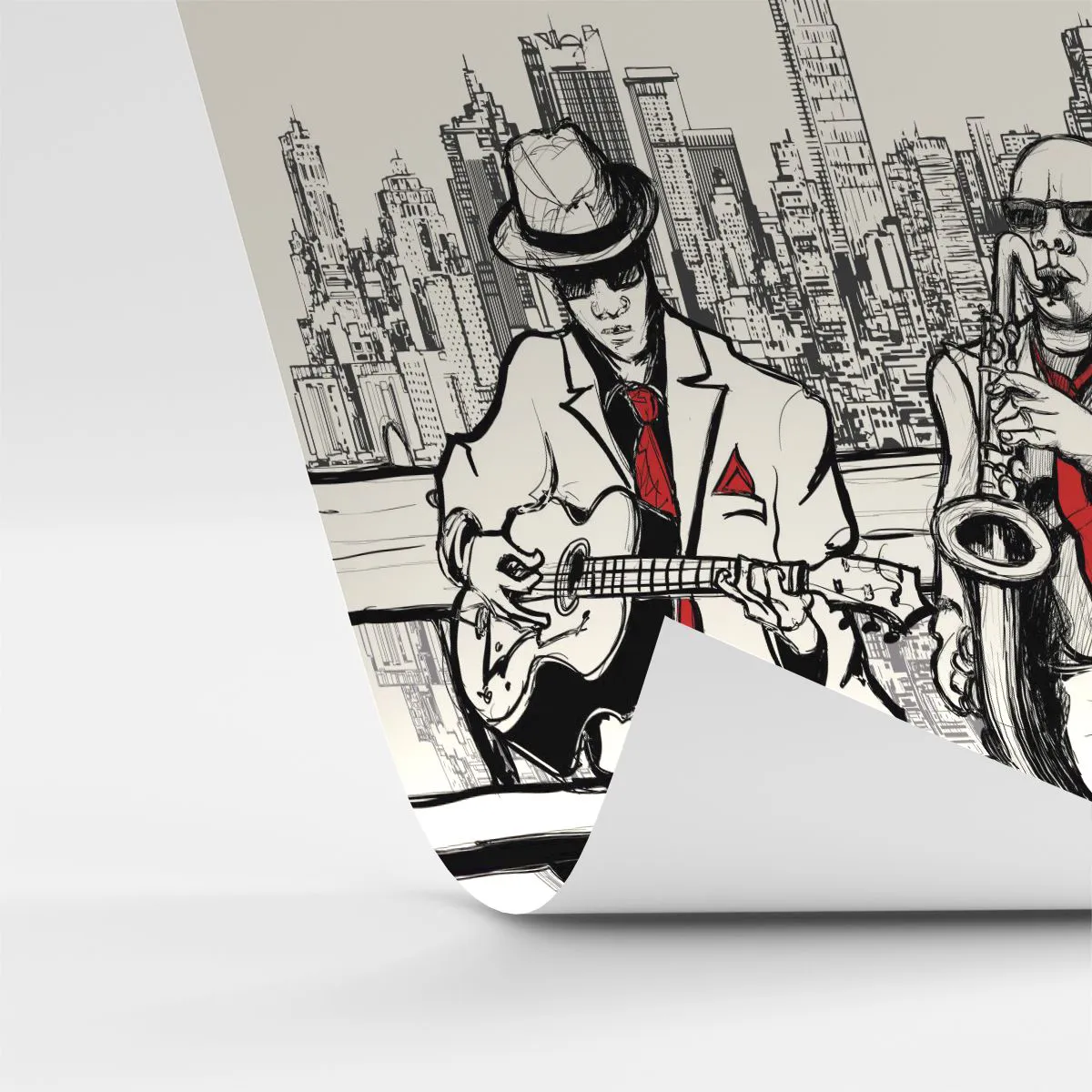 A "New York-i improvizáció" egy rendkívül stílusos fotótapéta, amely két jazz zenészt ábrázol, akik gitáron és szaxofonon játszanak egy városkép előtt. Az illusztráció monokróm stílusban készült, piros díszítéssel, ami egyedi karaktert és elegáns megjelenést kölcsönöz neki.