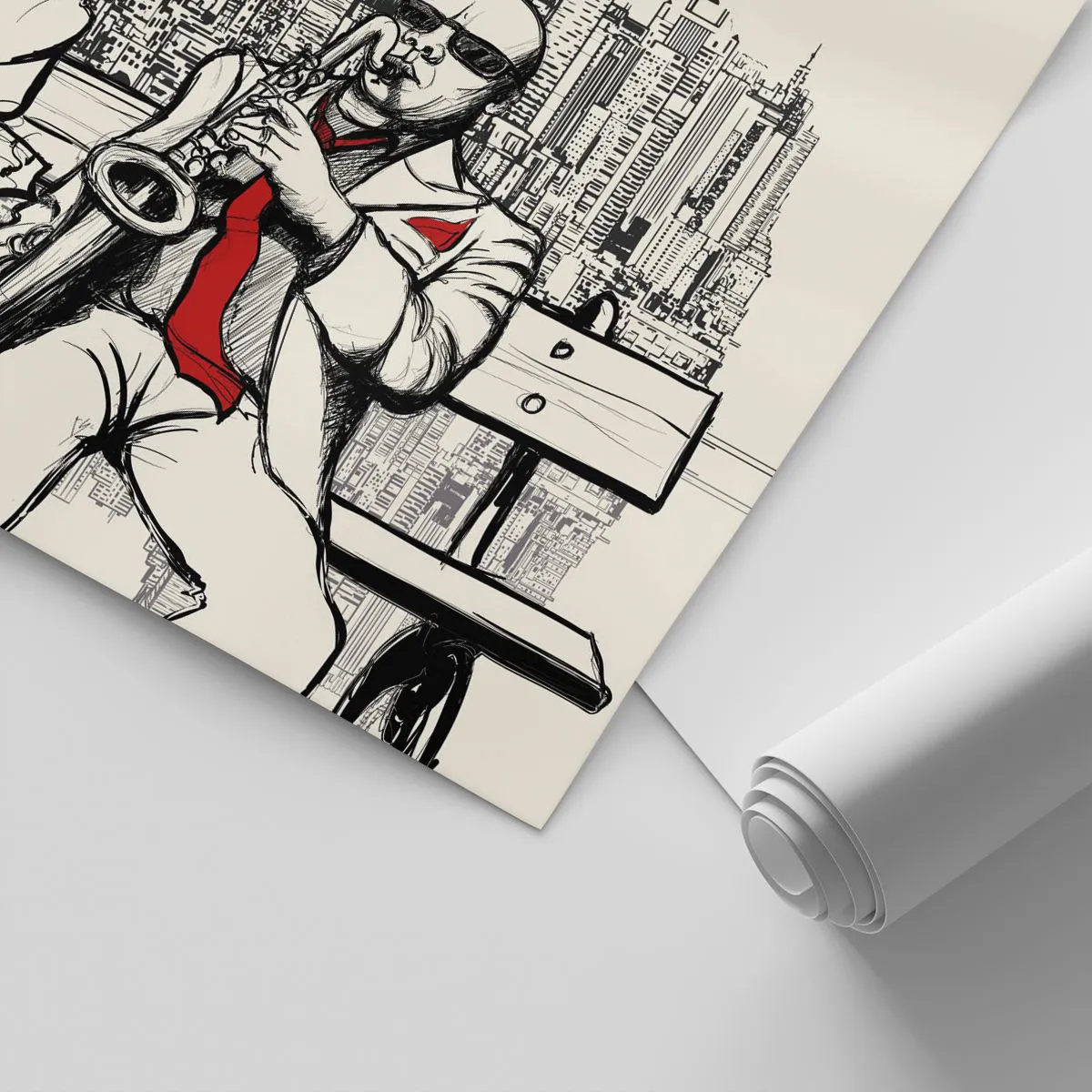Ez a dekoráció tökéletes nappaliba, irodába, étterembe vagy művészeti térbe. A fotótapéta eredetiséget kölcsönöz a belső térnek, és hangsúlyozza a zene iránti szenvedélyt. A klasszikus jazz és a városi táj kombinációja egyedi, dinamikus vizuális hatást kelt.