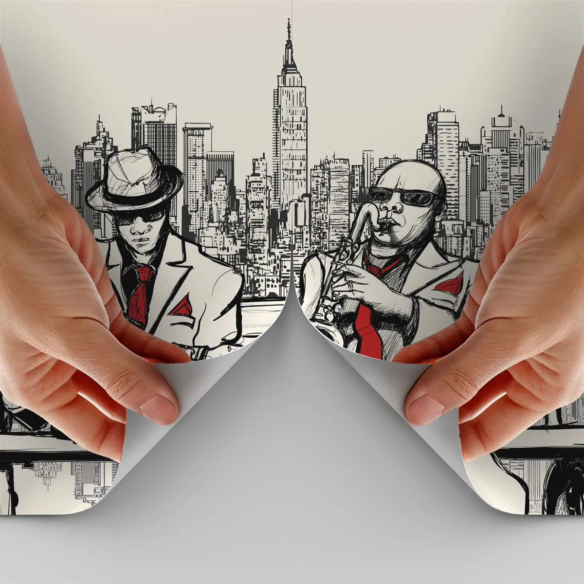 A rajzfilm stílus művészi kifejezést kölcsönöz a kompozíciónak, a modern felhőkarcolók panorámáját ábrázoló háttér pedig New Yorkkal, a jazz és a zenei kifejezés városával asszociál. Elegáns öltönyös és jellegzetes kalapokat viselő zenészek repítik a nézőt a jazzklubok és utcai koncertek hangulatába.