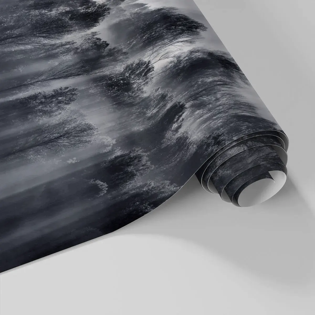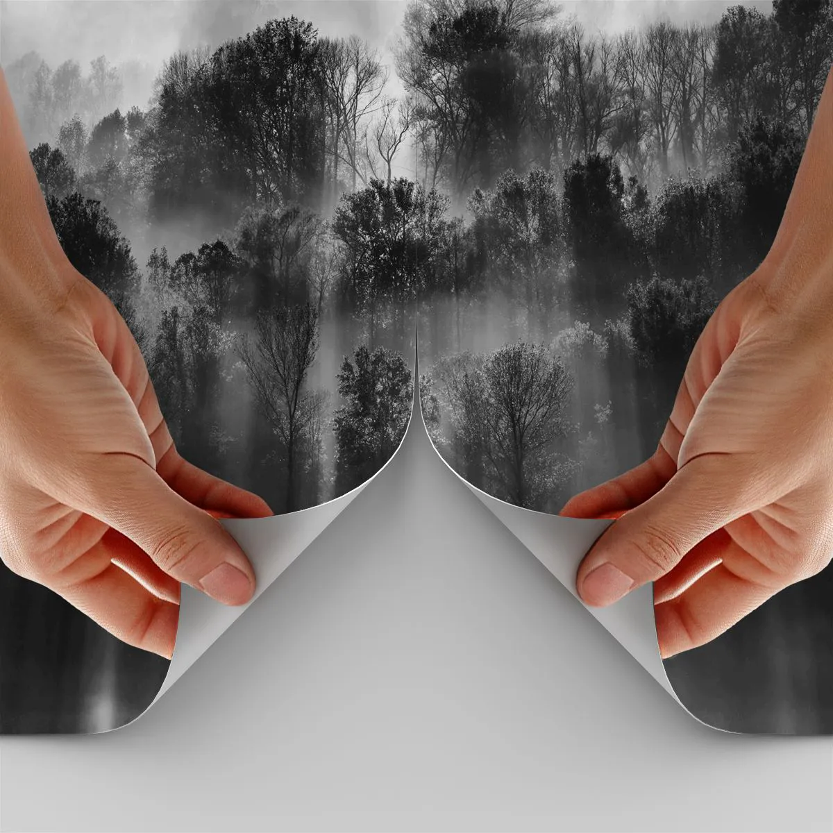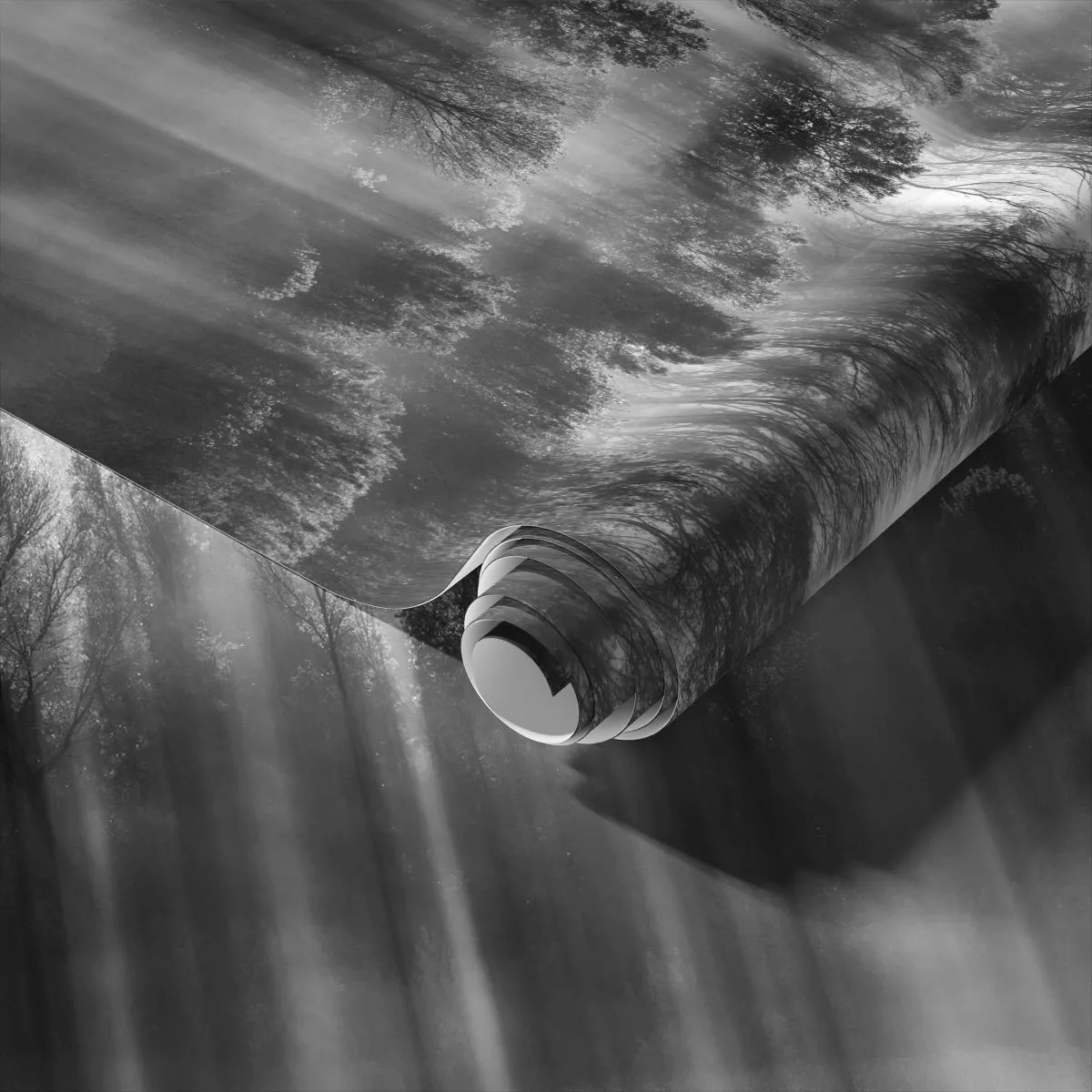 - Ez a fekete-fehér tapéta egy titokzatos hajnali erdőt ábrázol, amelyen átszűrődő fénycsíkok láthatók. A kompozíció békét, nyugalmat és természetes szépséget sugároz, így tökéletes hangulatos belső terekbe.