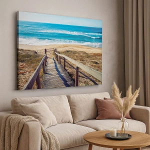 - Ez a festmény egy fából készült ösvényt ábrázol, amely az azúrkék óceánparti strandra vezet. Tökéletes a természet szerelmeseinek, nyugodt és nyári hangulatot teremt bármilyen enteriőrben.