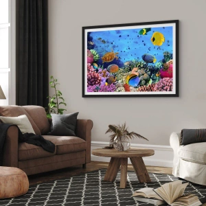 - Ez a poszter egy korallzátony színes víz alatti világát ábrázolja, trópusi halakkal és egy tengeri teknőssel. Tökéletes egzotikus hangulatú enteriőrökbe. A termékhez egy fekete, 50x70 cm-es keret tartozik.