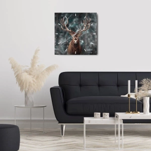 Falióra, Óra - Egy büszke szarvas egy havas erdőben, elmosódott fákkal a háttérben. - 30x30cm - Az erdő királya koronázva - Modern fali dekoráció nappalihoz, konyhához és hálószobához ARTTOR