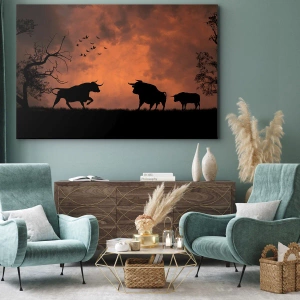 Vászonkép - Bikák sziluettjei narancssárga égbolton naplementekor - 70x50cm - A természet drámai előadása - Modern fali dekoráció nappalihoz és hálószobához ARTTOR