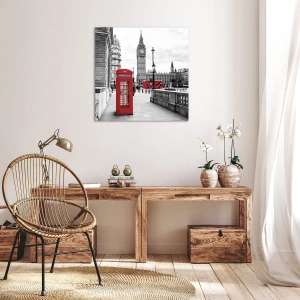 A festmény eleganciát és nosztalgiát sugároz, London hangulatát idézi - egy történelemmel, kultúrával és jellegzetes szimbólumokkal teli városét. A fülke intenzív vörös színe és a visszafogott háttér közötti kontraszt hangsúlyozza a motívum egyediségét, így bármilyen elrendezés fókuszpontjává válik.