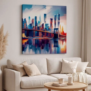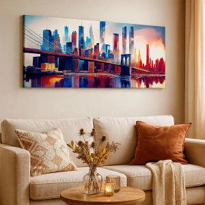 - Egy vászonkép, amely New York látképét ábrázolja egy híddal és annak tükörképével a vízben. Tökéletes kiegészítője a modern enteriőröknek, kiemelve a városi stílust.