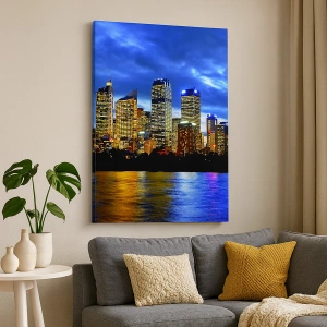 A kivilágított épületek látványa a dinamizmust, az energiát és a modern életstílust szimbolizálja. A felhőkarcolók változatos magassága és a vízben tükröződő színes tükröződések mélységet adnak és vonzzák a tekintetet. A festmény tökéletes lesz nappaliba, irodába vagy dolgozószobába, kiemelve a belső tér eleganciáját és stílusát.