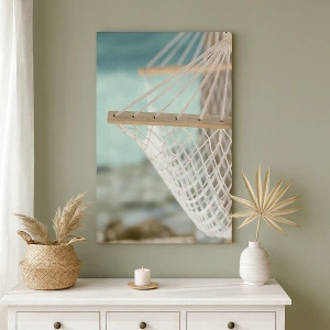Vászonkép - Függőágy, kilátással a türkizkék vízre - 70x50cm - Itt az ideje a pihenésnek - Modern fali dekoráció nappalihoz és hálószobához ARTTOR