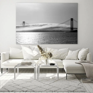 Üveg kép - Egy fekete-fehér híd, köddel a víz felett - 70x50cm - Áthajózni az Arany Kapun - Modern fali dekoráció nappalihoz és hálószobához ARTTOR