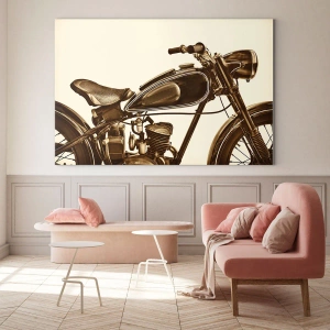 Egy stílusos retró motorkerékpár szépia árnyalatokban világos háttéren a letűnt idők klasszikus stílusát és eleganciáját idézi. A minimalista dizájn és a nosztalgikus színek kifinomult és karakteres dekorációvá teszik. Tökéletes választás azok számára, akik értékelik az autóipar történetét és az egyedi díszítőelemeket.