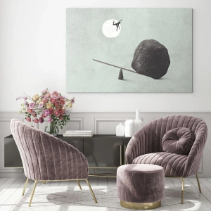 Üveg kép - Egy minimalista jelenet, amelyben egy férfi a Hold felé repül. - 70x50cm - Valóra vált álom. - Modern fali dekoráció nappalihoz és hálószobához ARTTOR