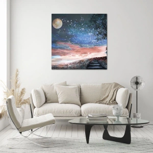 - Egy romantikus festmény, amely egy szerelmes párt ábrázol csillagos ég alatt, a holddal és egy mesebeli tájjal a háttérben. Érzelemmel teli dekoráció, tökéletes lélekkel teli enteriőrökbe.