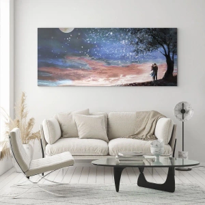 Üveg kép - Egy szerelmes pár egy fa alatt, a holddal és a csillagokkal - 70x50cm - Csillagos előadás - Modern fali dekoráció nappalihoz és hálószobához ARTTOR