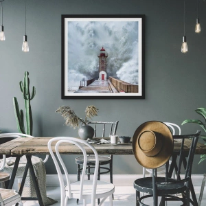 Poszter fehér keretben - Egy világítótorony, amelyet erős hullámok vesznek körül viharban - 50x70cm - A vizek ordítása, a vihar zaja - Modern fali dekoráció nappalihoz és hálószobához ARTTOR