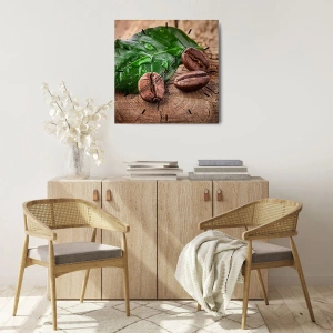 A "{title_coffee_leaf}" egy stílusos falióra, amely a természet szépségét ötvözi a rusztikus stílus esztétikájával. A motívum kávébabot és egy zöld levelet ábrázol, fa felületre helyezve. Ez a harmonikus kompozíció kiemeli a kávé természetes szépségét és aromás szimbolikáját, tökéletes kiegészítője lehet egy konyhának, kávézónak vagy más hangulatos enteriőrnek.