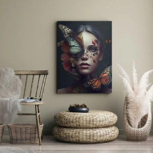 - Egy nő művészi portréja pillangókkal és virágos elemekkel kombinálva. Ez a festmény egyedi stílusával és harmóniájával tűnik ki, így ideális kiegészítője lehet egy nappalinak vagy hálószobának.