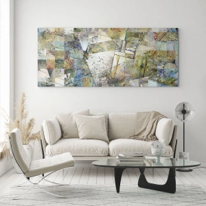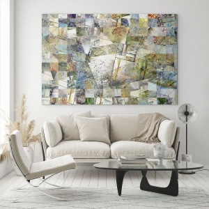 - Egy színes, absztrakt, töredezett formákból álló elrendezés, amely egy patchworkre emlékeztet. Ez a dinamikus és többrétegű kompozíció tökéletes egy modern nappaliba vagy irodába.