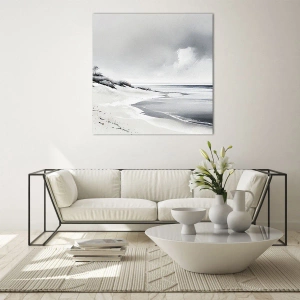 - A festmény egy nyugodt tengerparti tájat ábrázol fekete-fehérben. A minimalista forma és a visszafogott színek hangulatos hangulatot és nyugalomérzetet teremtenek.