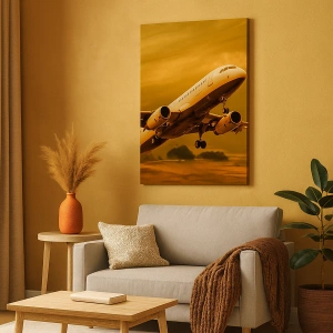 A "Repülés a nap felé" című vászonkép egy utasszállító repülőgép fenséges felszállását ábrázolja naplementekor, aranyló égbolt hátterében. A meleg színek és a dinamikus kompozíció hangsúlyozzák az utazással és a világ felfedezésével járó mozgást és érzelmeket. Ez a látvány kalandvágyat és új helyek felfedezését sugallja.
