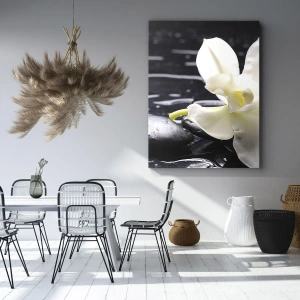 Egy fehér orchidea fekete kövek és víz hátterével tökéletes dekorációs lehetőség modern és elegáns belső terekbe. Ez a vászonkép a béke és a harmónia hangulatát teremti meg, egyedi stílust és eleganciát kölcsönözve bármely helyiségnek.