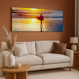 Vászonkép - Egy szörfös sétál a tengerparton naplementekor, kezében egy deszkával. - 70x50cm - A harcos visszatérése - Modern fali dekoráció nappalihoz és hálószobához ARTTOR